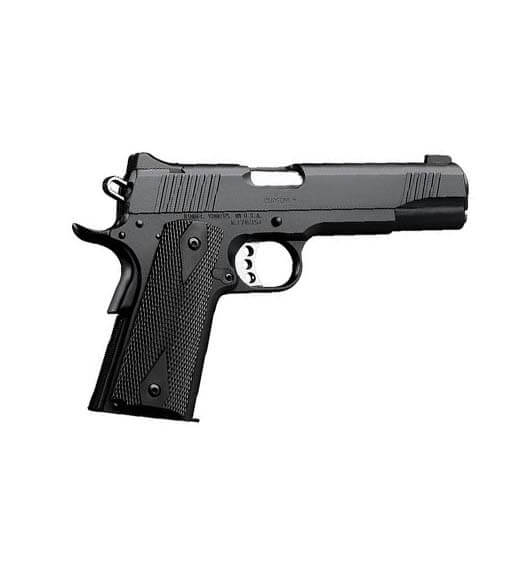 The Kimber 1911 Custom II .45 ACP pistol features an extended beavertail grip safety, a thumb safety, low profile sights that are mounted in machined dovetails to prevent snagging, and a 5″ match grade barrel.