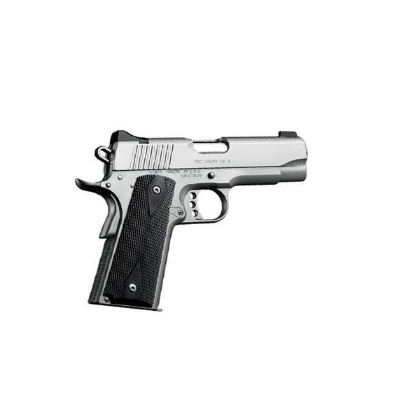 This Kimber 1911 Pro Carry HD II .38 Super pistol has a satin silver finish with black synthetic, double diamond grips. It features a match grade 4″ bushingless bull barrel, extended beavertail grip safety, thumb safety, and low profile sights that are mounted in machined dovetails.