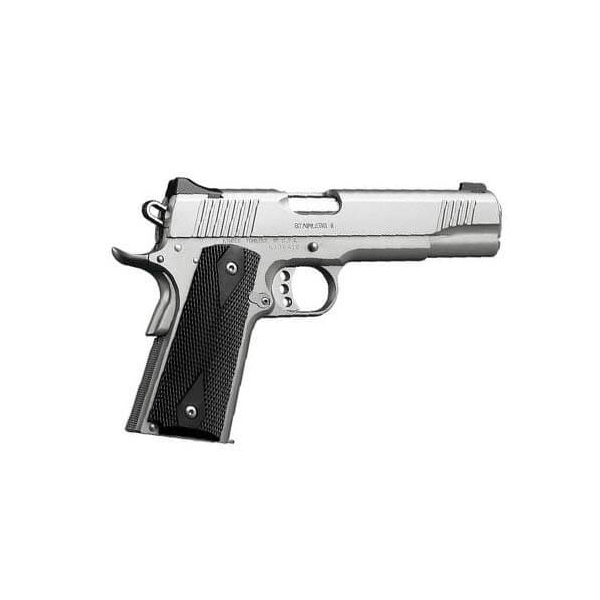 The Kimber 1911 Stainless II .45 ACP pistol features an aluminum match grade trigger, fixed low profile sights, black synthetic double diamond grips, a stainless steel match grade barrel, satin silver stainless steel slide, and satin silver stainless steel frame.