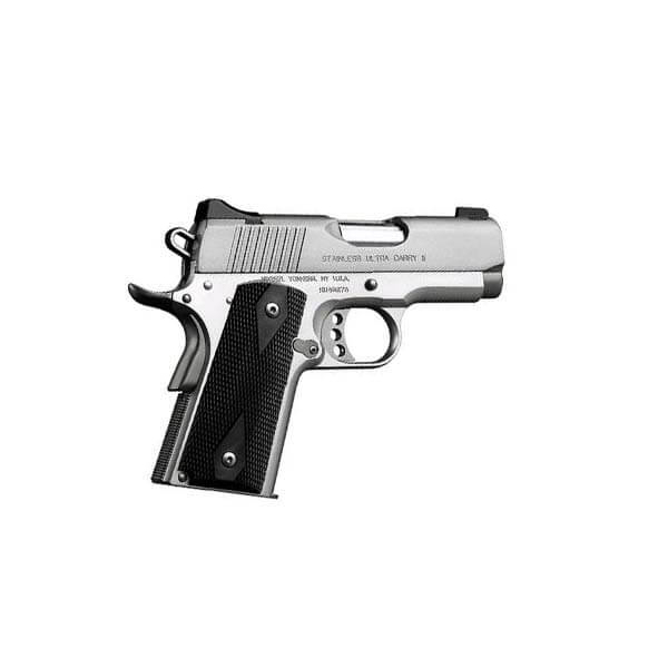 This Kimber Stainless Ultra Carry II .45 ACP pistol has a lightweight aluminum frame with a satin silver finish and black synthetic, double diamond grips. It features a match grade ramped 3″ bushingless bull barrel, low profile sights that are mounted in machined dovetails, and an extended beavertail grip safety and thumb safety.